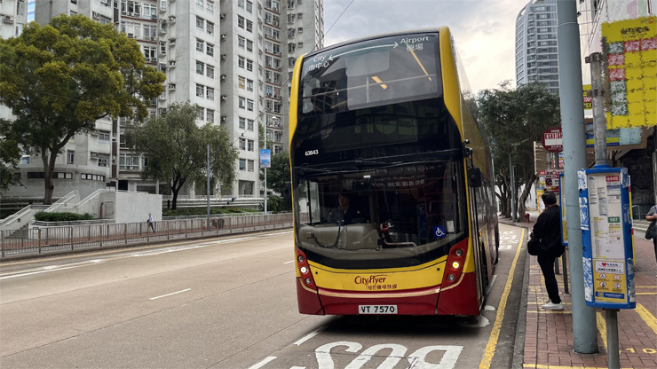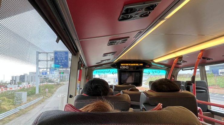 バスは満席。 ルール上アッパーデッキには立てないため全員着席も、下では立っている乗客がかなりいます。いつもの最前席は取れず、残念。。。(-。-; どうやら、香港国際空港だけでなく、その先のマカオに行く人も結構乗っているみたい。 イースターの大型連休だからなぁ、、、
