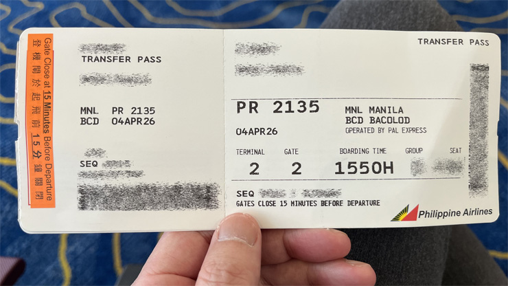 今回は、およそ2時間のトランジット。 すべてスムーズなら最高の乗り継ぎだけど、香港からのフライトが遅れたり、予期せずイミグレで時間を取られたりするとアウトです。 賭けのようなもの?だけど、今回はすべてスムーズでよかった! このあとは、当地時間16:20発のフィリピン航空2135便(PR2135)バコロド行 〜 ↓