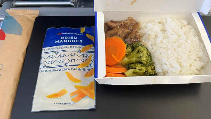 エクスペディアで予約すると座席の事前指定は別料金で、USD 30をケチったのがイケなかった!(笑) 今回は窓側の席が取れず通路側となってしまい、あーれー (-。-; 搭乗後少し機内で待たされて、出発は当地時間12:07。定刻(同11:30)よりおよそ40分の遅延となりました。マニラでいつものようにターミナル1から2への移動があるのでチト心配だけど、これぐらいなら巻き返せるかな。 機内食。 「Chicken」と「Fish」のチョイスがあり、迷わず前者にします。 チキンはチキンしかないけど、フィッシュはどんなフィッシュが出て来るか分からないからね。石橋を叩いて渡る、まさに「チキン」。(笑) これ↓意外と美味しかったりします。機内食で出れば仕方なく食べる、というレベルではあるけどな。