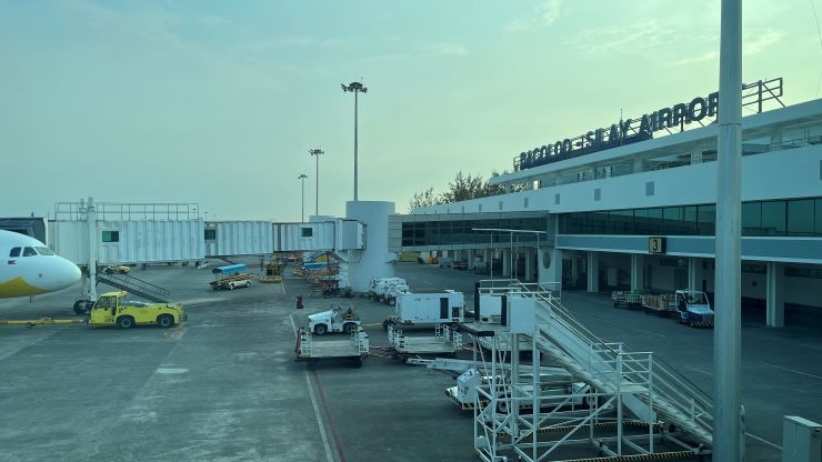 マニラからバコロドまで実飛行時間は58分、とアナウンスしています。 アッと言う間に最終着陸態勢。 ということで、やって来ました、バコロド・シライ空港。国際線の乗り入れはなく、ゲートも2つしかない、ごく小さなローカル空港です。 ↓
