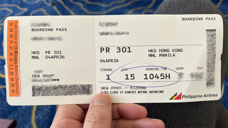 マニラからは、いつものフィリピン航空306便(PR306)香港行。 当地時間14:40発で、搭乗時刻は13:55と出ています。トランジットは2時間5分か 〜 ↓