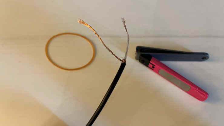 トラウマになりそうだけど ^^;; とにかく、油断しないでダブルチェックするしかないのかな。。。 取りあえずD-808(XHDATA)は持参しているので、これでローカル局とFMをワッチすることにします。 ほんの20年前はSDRなんてなかったわけで、皆こうアナログでやっていたじゃないの、とでも思うしかないか、、、 (-。-; (-。-; (-。-; 朝、師匠のNさんよりアドバイスいただき、応急措置に再チャレンジしました。 たまたま持参していた爪切りで、同軸ケーブルの被覆を剥きます。 ↓