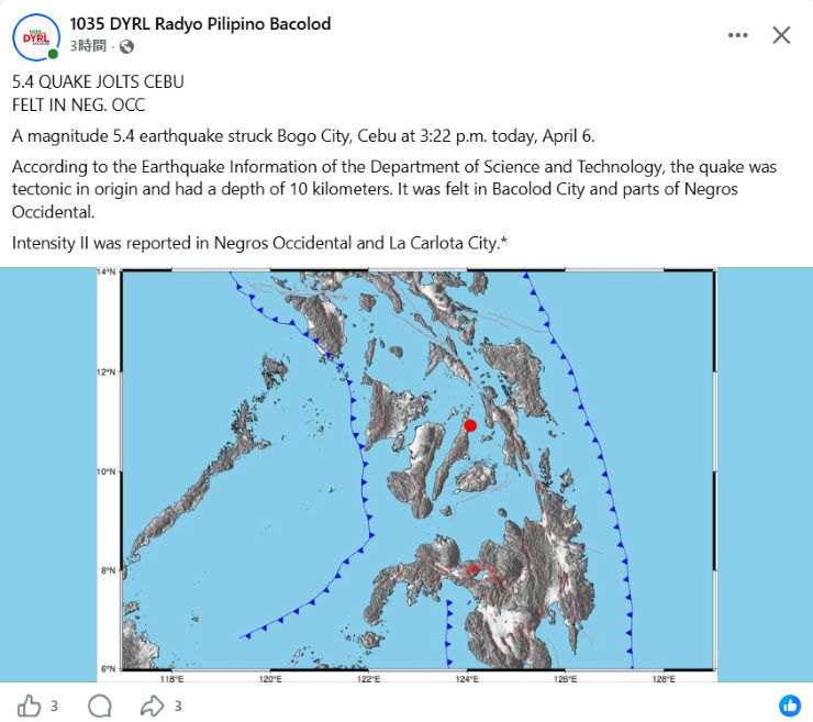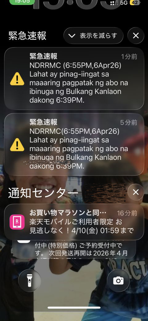 夜、ケータイで緊急速報が。 タガログ語なのでよく分からんのですが、その後、Danteさんよりいただいたアドバイスより、Kanlaon(カンラオン火山)が噴火したらしいことが分かりました。 午後の地震との因果関係はよく分からないけど。 直線距離では30キロほどで、火山灰が降る恐れもあるみたい。 ↓