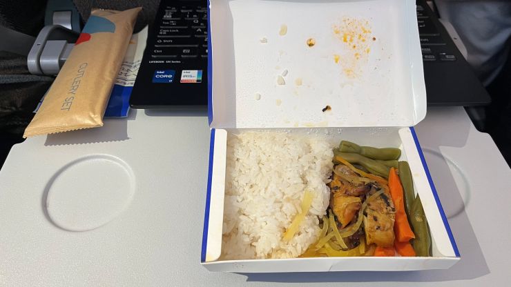 フィリピン航空のエアバス・A350-900(359)は、エコノミーでも座席のピッチがかなり広いような。 北米とか長距離路線に使われている機材のようだけど、これならラクでいいや! でも、機内食はやっぱりフィリピン航空。(笑) まぁ、1時間半ほどの短距離フライトだからね。↓