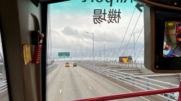 バスは満席。 ルール上アッパーデッキには立てないため全員着席も、下では立っている乗客がかなりいます。いつもの最前席は取れず、残念。。。(-。-; どうやら、香港国際空港だけでなく、その先のマカオに行く人も結構乗っているみたい。 イースターの大型連休だからなぁ、、、