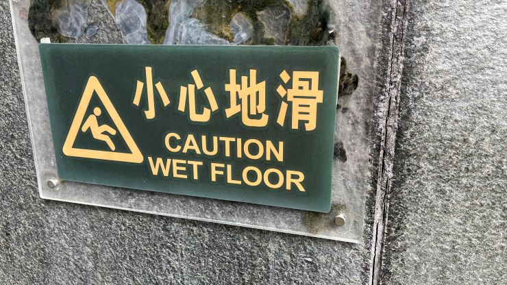 「小心地滑」 香港には米国駐在時代から何度も出張で来ていて、一番インパクトがあった広東語がこれ。 「小心」は「Be careful(注意)」、「地滑」は「床で転ぶこと(転倒)」で「転倒注意」とか「足元注意」といった意味になるわけだけど、「地滑」は、ニッポン人にはいわゆる「地滑り」でしかないので滑稽に聞こえてしまいます。(笑) ↓