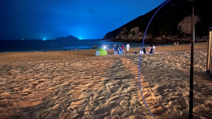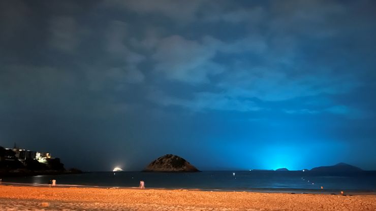 ただ、ビーチにいる人は少しずつ減って来ます。 クルーズ船が出航したみたい。また、遠くでは洋上でものすごく明るい光線を放つ船がいて、夜空が照らされています。どうやら天気は大丈夫みたい。^^ ↓