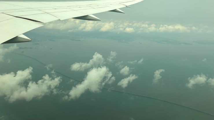 本日のフライトは、当地時間10:10発のエバー航空892便(BR892)台北行。 前回(2025年10月)は乗客が殆ど乗っていないガラガラの機内に驚いたことをよく覚えています。 今日も、搭乗率3割ぐらい? ガラガラです。大丈夫かな??? 台湾なので、いつものように経費節減のエコノミー。^^;; 離陸して、マカオの手前で大きく左に旋回。南シナ海に出ます。眼下には、香港からマカオに繋がる世界最長の港珠澳大橋。 ↓