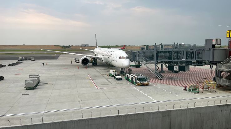 夕方、桃園国際空港へ。 帰りのフライトは、当地時間18:10発のエバー航空857便(BR857)香港行。 スターアライアンスのロゴ・デザインのボーイング・B787-10(B87X)です。 ↓