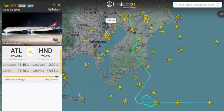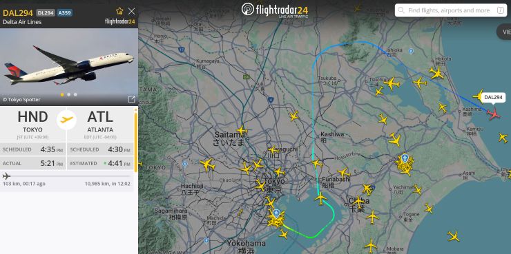 長女氏が明日夕方発のフライトでアトランタに行くので少し心配していたのですが、本日のフライトも定刻通り飛んでいるので大丈夫そうかな。 しかし、カムチャツカ半島沖大地震による津波騒動があったかと思えば、今度は台風。(-。-; やれやれ 〜 ■ 2025年8月2日(土) 〔 TOP 〕 いつものように早朝から山歩きに出かけるべく前夜より準備して休んだのですが、アレレ、これがまた明け方から激しい雷雨。午前中は赤雲警報が発出されたりで、こりゃダメだ 〜 (-。-; 天気には勝てないので、やむなく自宅でのんびりの週末スタートとなりました。 午後になっても雨は断続的に降り続き、あいやいやー (-。-; ジジババ宅に居候していた長女氏は、昼過ぎに羽田空港へ。 これから夕方発のフライトでアトランタに向けて出発です。 わたしがはじめて留学で海外(米国)に渡航したのは、大学3年。忘れもしない、1990年8月26日(日)です。その直前、ちょうど35年前の今日イラクによるクウェート侵攻があり、両親からは心配されたりしたのでした。 あれから35年。長女氏も当時の自分と同じ大学3年。単身でアメリカに渡航するのは初めて、ということで、何だか重なるところが多い 〜 わたしは海外に出ること自体がはじめてでしたが、長女氏は、小さい頃からもう何度となく、アメリカや香港と日本を往復しています。英語もネイティブだし比較にならないわけですが、日本の生活に慣れたこのタイミングでアメリカに行ったときどのように感じるのか、違和感はあるのか、ぜひとも帰国後に訊いてみたいところです。 今回は、父が貯め込んだ55万マイルのマイレージから、14マイルをプレゼント?しました。残り41万マイル。デルタは(今のところ)マイルに有効期限がないのはいいとして、日本在住だと事実上アメリカ行の太平洋線しか選択肢がないのが難、です。 早く自分で使わないと、家族に使われてしまいそうだけど、、、^^;; 今回は、小学校時代の友人(もちろんアメリカ人)宅を転々とするんだとか。日本人の知り合いは全くいないところがミソですが(笑)、いい経験だなぁ 〜 自分の初訪米からちょうど35年後に自分の子供が単身で訪米、というのは、何とも感慨深いものです。 「ラジオ持った?」と聞いたら「それ、パパでしょ」と冷たく?あしらわれたのはご愛敬。^^;; フライトは、ほぼ定刻で羽田を離陸 〜 民間企業の経営合理性からすれば絶対的に最短距離を飛行したいはずですが、それでも敢えてこのようなルートを飛ぶ理由って、どういうものがあるのかな? 成田との関係??? ↓