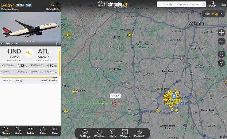 可もなく不可もなく、といったところかな。^^ ■ 2025年8月3日(日) 〔 TOP 〕 それにしても、昨夜からよく降ります。今朝も激しい雷雨となりました。(-。-; (天気が回復すれば)昨日は行けなかった山歩きでも、と思っていたのですが、とてもムリ。この後も回復する感じではないので次週末以降に持ち越し、です。 けたたましい雷で目が覚めると、当地時間04時半少し前。 そう言えば長女氏のフライトは夕方着だったな、と思いチェックすると、ちょうどハーツフィールド・ジャクソン・アトランタ国際空港に着陸寸前でした。^^ ↓