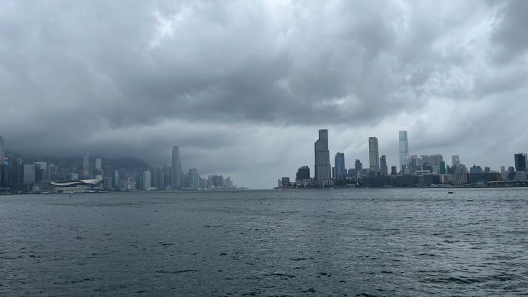 いつも、香港島や(週末に登っている)柏架山がよく見えるのですが、今日は薄暗いうえに暑い雲に覆われて何も見えない 〜 ↓