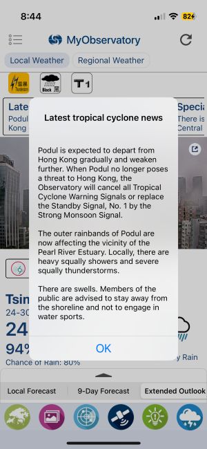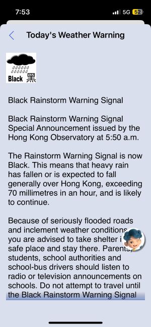 それにしても雨がよく降ります。先週土曜からずっとこんな感じ。 外は薄暗く、低い雲が立ち込めています。それでいてムシ暑いのだからタチが悪い。 うーん、この時期は仕方ないなぁ、、、(-。-; 朝、いつものように自宅を出たのですが、アレレ、何だか様子がおかしいぞ。(-。-; 最寄りのMTR駅に続く、自宅マンション階下のショッピングモール、何だか閑散としています。 もしかして!と思いお天気アプリをチェックすると、、、なるほど、黒雲暴風警報か 〜 (-。-;