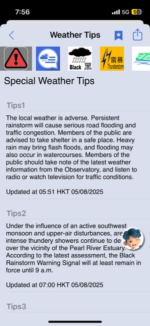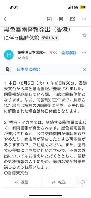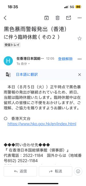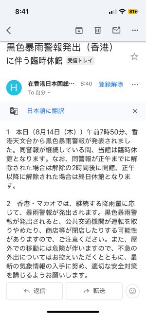 これから先は次第に遠ざかるので大丈夫とは思いますが、少し西にズレていたらかなり影響があったと思うので、危ない危ない 〜 (-。-; と思ったら、アレレ、当地時間07:50、黒雨暴風警報が発出となりました。 在香港日本国総領事館は、待ってました!とばかりに臨時休館。 規定とはいえ、公務員は気楽でいいよな。。。 ↓