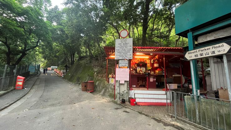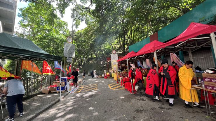 海抜数メートル地帯に住んでいて登山口まで徒歩10分、500メートルの山頂までおよそ1時間半、というのだから、香港ってのはすごいところだ。 今日は、登山口のお宮さんに人が沢山います。何これ? ↓