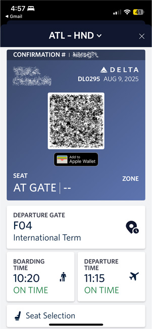 1週間のご褒美。 先月は自宅での液体燃料注入を1カ月控えていたのですが、まぁ、週イチならいいか 〜 ^^;; 2日(土)よりアトランタの友人宅に滞在していた長女氏、本日発のフライトで日本に戻ります。 復路は、時差の関係で見かけ上2日かかり、羽田到着は明日の午後。 米東海岸(夏時間)と香港の時差は12時間で、ただ昼夜を逆転させるだけなので分かりやすい 〜 今回は、わたしがこれまで旅行や出張で貯めた虎の子の55万マイルのうち14万マイルを拠出した、無料航空券です。 日本からアトランタに直行便を飛ばしているのは、デルタだけ。この寡占路線は同社のドル箱で、アトランタがメジャーな渡航先というより、アトランタを経由してデルタの路線ネットワークで全米や中南米などに散らばって行く乗客で常に高い搭乗率を誇っています。 そのため、座席もギリギリまで割り当てられない 〜 (-。-; 親バカ、もといバカ親のわたし ^^;; は長女氏に代わってオンラインでチェックインも、座席は「AT GATE」となっています。シートマップを見ても、アレレ、空席が全然ないぞ。。。(-。-; (-。-; (-。-; ↓