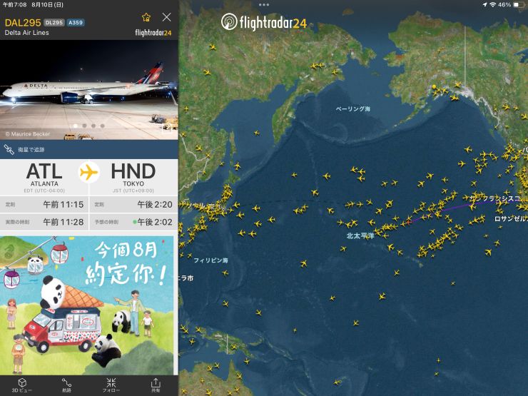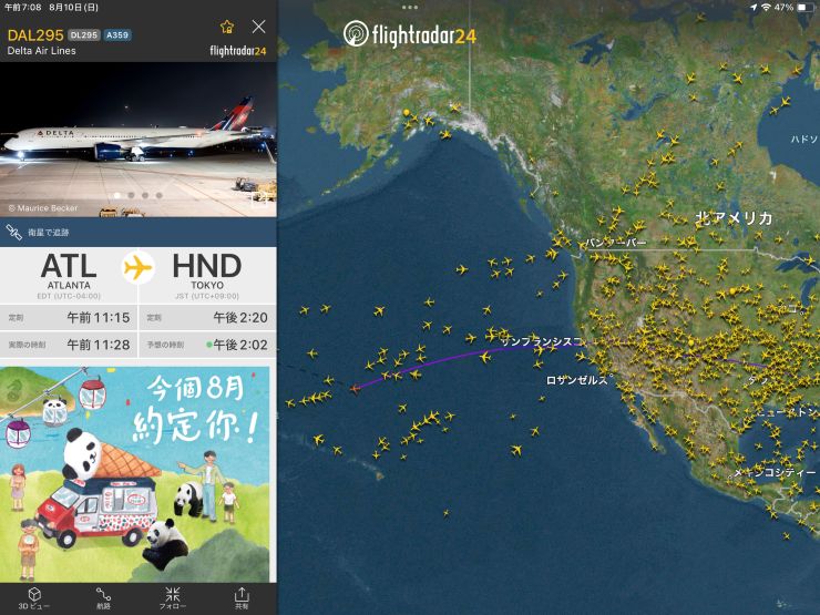 「CLASS N」や「CLASS NE」はエコノミーの最下位クラス(無料航空券)。いやぁ、危ない危ない 〜 でも、乗ってしまえさえすれば、こちらのもの! こうしてギリギリで滑り込むあたり、うちの長女氏や長男氏は得意技なので結果オーライだな。(笑) ■ 2025年8月10日(日) 〔 TOP 〕 長女氏のフライト(DL295)、今回はサンフランシスコを抜けて太平洋に出るレアなコースです。 ↓