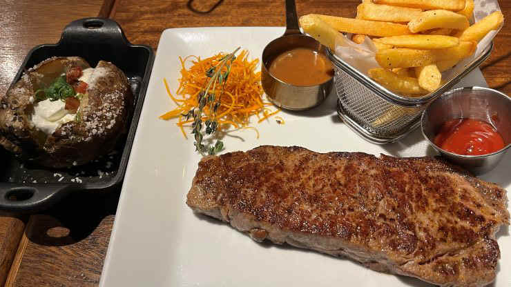 14オンスのNew York Strip。 フィレだと8オンスがあってちょうどいいのですが、New York Stripの14オンスはヘビー。(若い頃はペロリとイケたけど ^^;; ) サイズ半分でいいから値段も半額にしてもらえると嬉しいんだけどな。^^;; ↓
