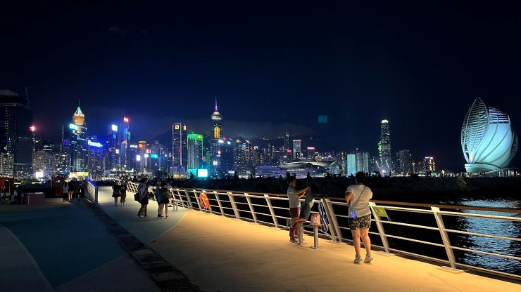 お腹が満たされたところで、銅鑼湾から自宅まで、奥方と海沿いのプロムナードを小一時間ウォーキング。(歩) 香港島の夜景がキレイです。^^ ↓