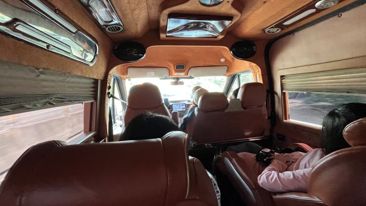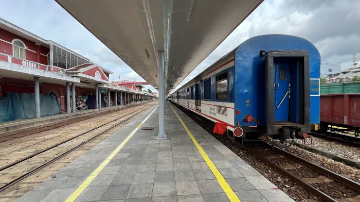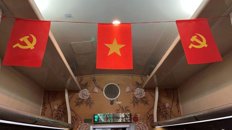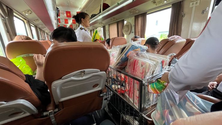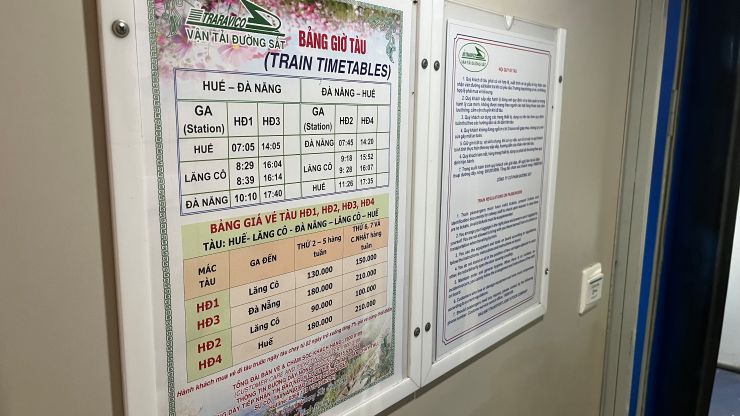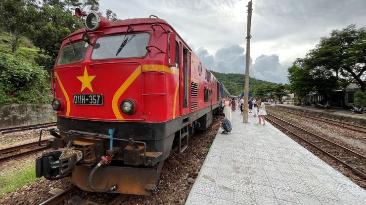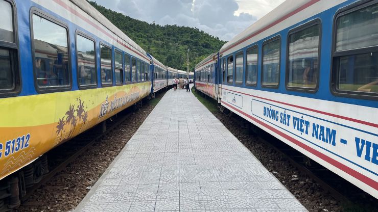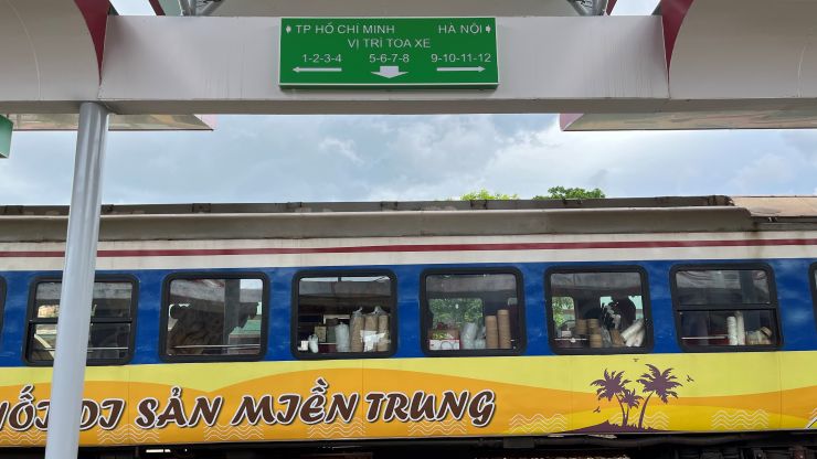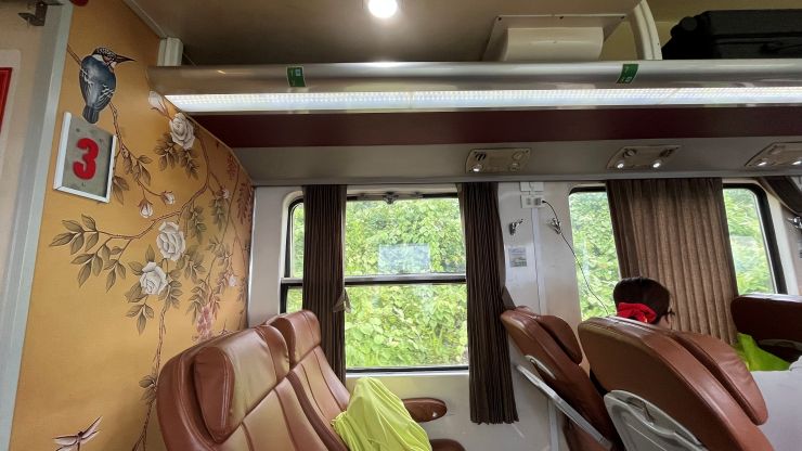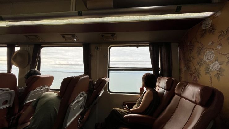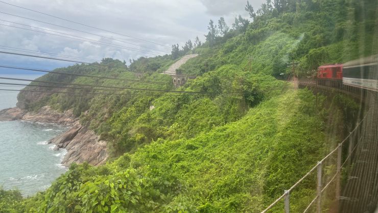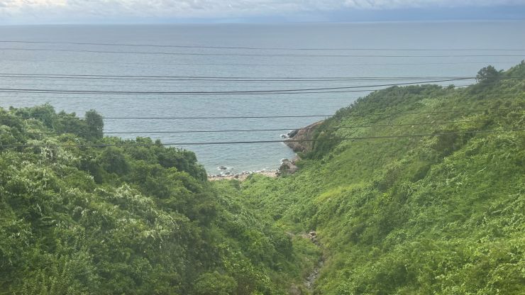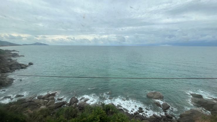 一方、左側では海が良く見えます。 この写真↓を見て「あれ?」と思った方は鋭い。そう、電車の進行方向は「右」なのです。だから海は「左側」というわけ。 この電車、車輛の半分あたりで座席が向き合うようになっています。日本のように座席を回転させる、という概念はなくて、半分は進行方向、半分は進行方向と逆、という、、、 先ほどのLang Co駅で左側に座っていた若い家族連れが降りたので、海沿いの景色を楽しめてラッキー。 ↓