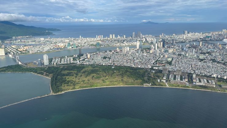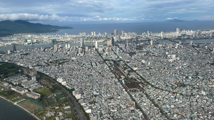 ほぼ定刻で出発 〜 過去の飛行経路からして市内が一望出来ると思い、右の窓側から2席を確保しました。今回宿泊したホテルもよく見えます。写真のほぼ中央にダナン駅。 さよならダナン、また来る日まで。^^ もう少しよく調べて来たら結構楽しめそうだ、と思いました。ホテルはまさかの爆裂ノイズで撃沈も、ビーチ沿いにはバルコニー付のホテルが沢山あり、また別の機会にチャレンジしてもいいかな。