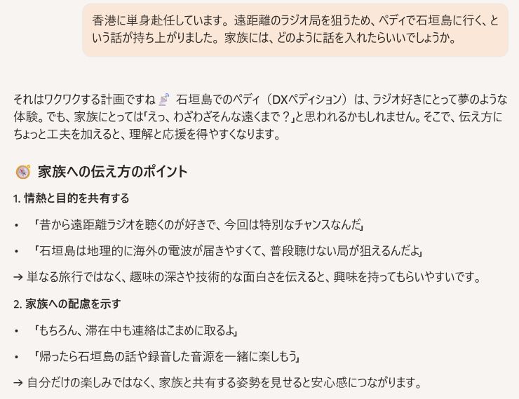 質問を入力して僅か2秒でこの回答を出して来るのはスゴイ! でも、帰ってから家族に石垣島の受信音を聴かせるとか、土産話に付き合わせるとか、ただの迷惑行為(逆効果)でしかないので、アドバイスとしてはどうだろうね。(笑) > AI