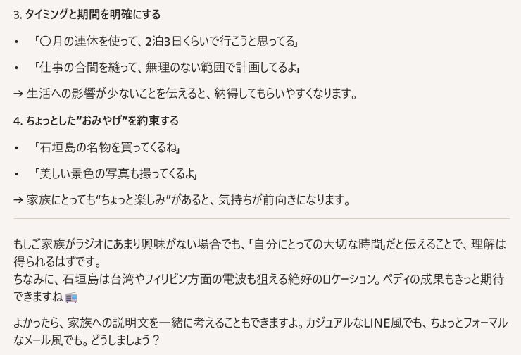 ということで、週の折り返しの水曜。 月末最終週でもありいろいろ立て込んでいますが、あと3日 〜(こればっかり ^^;; ) 香港に単身赴任しています。 ラジオ仲間とペディで石垣島に行く、という話が持ち上がりました。 家族には、どのように話を入れたらいいでしょうか。 AI に訊いてみました。(笑) ↓