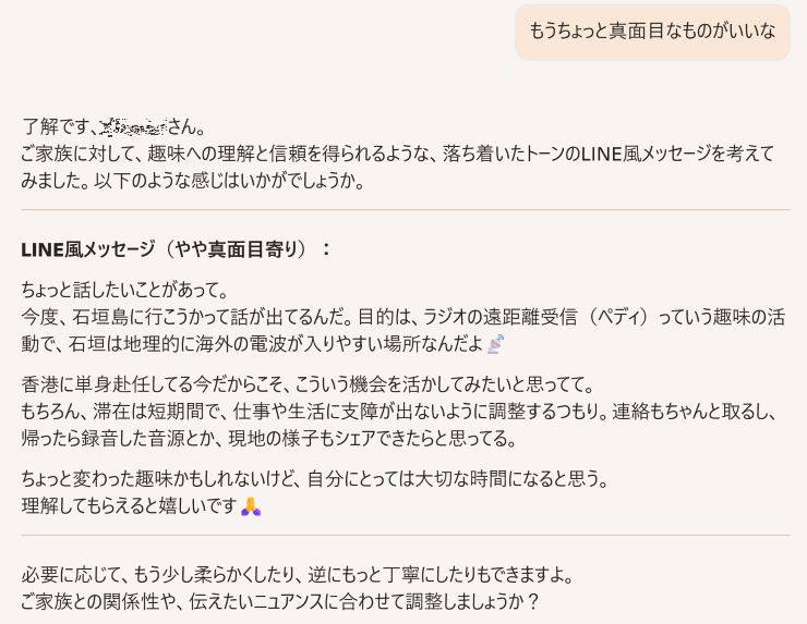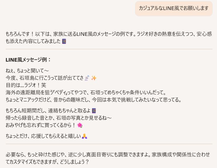 「石垣島は台湾やフィリピンの電波も狙える絶好のロケーション」って、、、よく知っておるな、AI! 一体、誰がそんなことを吹き込んだんだ???(笑) せっかくなので、では「カジュアルなLINE風」も訊いてみます。^^ ↓