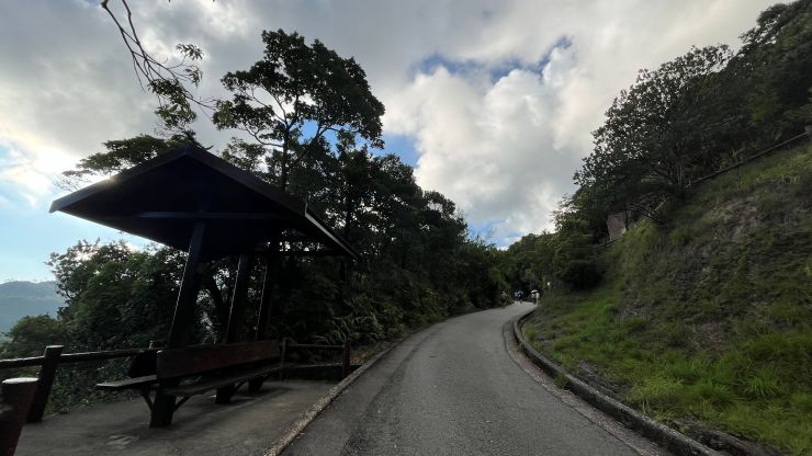いつものように、マイペースでゆっくり歩いて行きます。なだらかな坂がずっと続くので、これがまた意外とキツイ、、。(-。-; 1回目の休憩ポイントで水分補給 〜 ↓