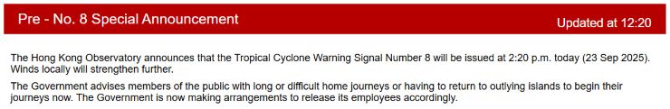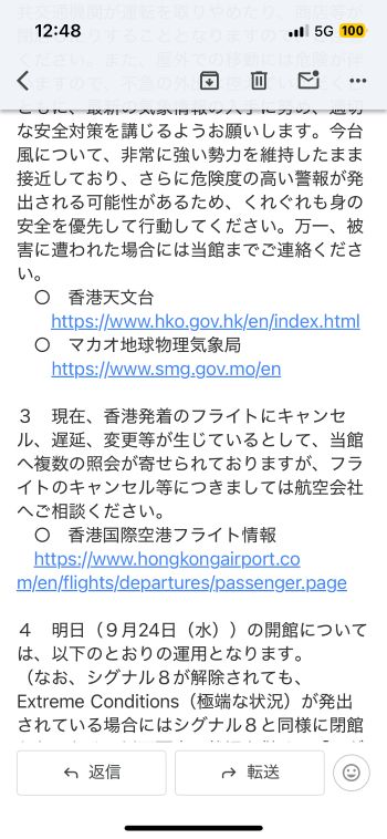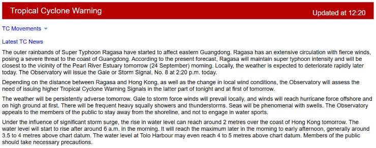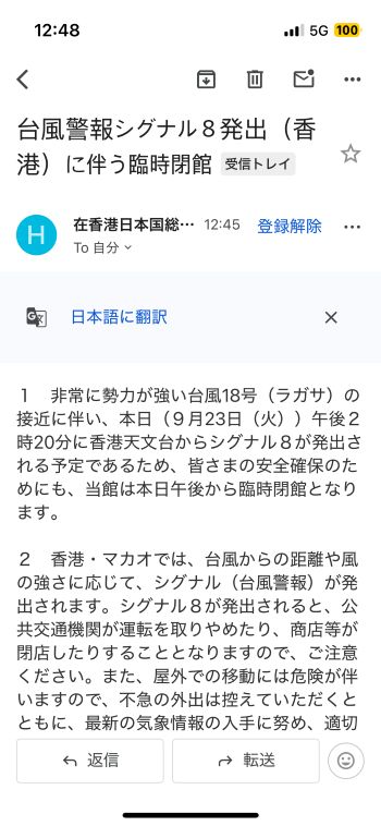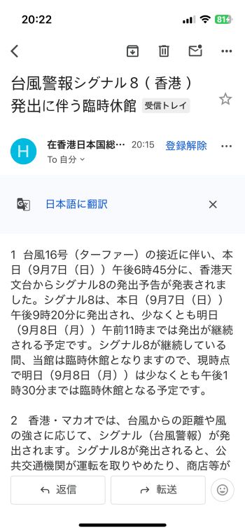 スーパー台風18号(ラガサ)の接近は、ここ数日の予測より少し早まるみたい。 香港に最も近づくのは、現時点としては明日の朝かな。(-。-; ↓ 今日は、このあと当地時間14:40の「シグナル8」発出が事前告知されています。 社内規定では「シグナル8」の発出でオフィスはクローズ、発出予告が出た場合はその予定時刻の2時間前に従業員を帰宅させる、としています。 ということで、本日は午前中いっぱいでオフィスは事実上クローズだな。 外を歩けないほど天候が悪化していなくても交通機関が乱れて難民状態になることもなくはないので、今回は素直にオフィスを出た方がいいかも知れませんですね。 従業員の皆は内心喜んでいる?かも知れないけど、売上に大きく響くのでホント、カンベンして 〜 (-。-; ということで、総領事館も午前中いっぱいでクローズ、との通知が来ました。 「皆さまの安全確保のためにも、当館は本日午後から臨時閉館となります」とあります。 サラッと流せばいいんでしょうが、でも、よく考えてみると「当館を午後から臨時休館にする」ことがどのように「皆さまの安全確保」に寄与するのか、よく分からない。(笑) まさか、「当館を開けておくと『皆さま』が午後も足を運んだりして安全を確保出来なくなる可能性があるから閉館にする」とでも言いたいのかな? だとしたら、ホントそうなのー??? ↓