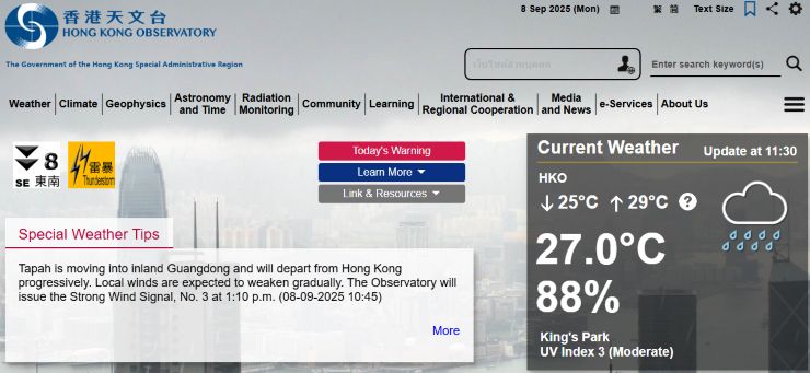 Life Radio Iloilo(DYRP)、今朝は日本時間05:16〜に国歌と開始アナウンスを確認。昨日は同04:00〜でした。 ニッポンの感覚ではゼッタイあり得ないわけですが、フィリ中局における放送開始時刻の変動ってのはどのように起こるものなのか、いずれまたどこかローカル局を訪問する機会があれば訊いてみたいところです。 つまるところ、「ホントに、日々適当に、始めたいとき始めるわけ?」というのが知りたい。 多分、そうなんだろうけどね、、、(何? そういうもんだろ? とでも言われて終わるだけのような気がしてならないんだけど) 週末。 熱帯低気圧が接近中、とのことで、朝から「シグナル1」が出ています。 「シグナル1」は、香港から800キロ圏内に熱帯低気圧が接近すると発出されるもので、初期の警戒段階です。明日 シグナル3 に引き上げられる可能性あり、とのこと。 この先の予報を見ると、明日以降ずっと天気が崩れるみたい。一方で、本日は概ね晴天と出ています。 今朝も早くに目が覚めてしまったので、当地時間07時少し前に自宅マンションを出ました。 ↓