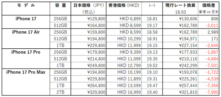 今朝は、Dagupan方面がよかったのかな。 ということで、水曜 - 週の折り返し地点まで来ました。^^ 昨日、iPhone 17 シリーズが発表となりました。 ただの17に加えて、Air、Pro、Pro Max、、、Air が薄いのは分かるけど ^^;; 他は、どこがどう違うのかよく分からない 〜 (まだちゃんと調べていない、というのもあるけど ^^;; ) 職業柄、価格設定にキョーミがあります。 日本と香港の販売価格を比較してみました。香港には消費税(VAT)がなく、一方の日本は税込です。 ↓