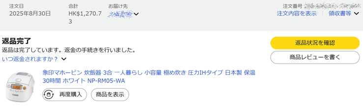 ケータイの新調を検討中の長女氏と「iPhone 17 は、今のレートなら香港で買った方が安いみたいよ」みたいな話をしていたわけですが、海外仕様のiPhone 13 miniは日本でTrade-in(下取り)してもらえないんだとか。(そうなの?) 「なら香港に来ればいいじゃん」などと不用意に口走ってしまったのが運のツキ。 「11/19〜25 は三田祭で大学は休みなんだー」 「この期間なら行けるなー」 ということで、全く予定していなかった長女氏の来港が電撃決定。(笑) 航空券を調べると、まだ香港航空が格安で出ていました。即断即決即実行でこれをポチリ! えっ? 往復の渡航費用は父の負担ですか??? 20、いや、もう間もなく21になろうという娘が父の単身赴任先である香港に1人で来てくれるって、嬉しいじゃありませんか。 まぁ、元々は自分の海外版iPhone 13miniを日本ではTrade-inに出せないから、ってのがコトの発端ではあるわけだけど、、、^^;; わたしが10月末に石垣島、11月下旬に長女氏が香港、12月中旬に奥方と長男氏も(義父を連れて)香港、ということで、まとまった出費が続きます。わたしの石垣島をいいことに、奥方も、今度は義母と長女氏を誘って韓国ツアーなどと言い出していて、やれやれ 〜 (-。-; 「今しか出来ないことは心置きなく今のうちにやっておこうぜ!」なんて都合のいいこと言って石垣島を進めたはいいけど、ジワリと副作用?が、、、^^;; ■ 2025年9月12日(金) 〔 TOP 〕 今週も、何とか1週間を乗り切りました。^^ 気づいてみれば、9月も間もなく折り返し地点。日本出張が再来週に迫っていて、香港に戻ると10月になります。 その前に片づけなければならないヘビーな案件が幾つかあって全く気が重いのですが、仕方ない 〜 アメリカで長く生活していた割に商品の返品はイヤで、過去にも、殆どしたことはありません。 衣料品など、実際に着てみたらどうしてもサイズが合わなかったとか、やむを得ない理由で交換してもらったことはゼロでないと思いますが、それですらものすごい罪悪感です。 自分の手元に来た、というのは何か縁のようなものがあるはずで、それを返す、というのはやはりイヤなもの。 自宅の炊飯器の調子が悪い、というので、先日アマゾンに象印さんの新品を発注しました。 円安なので、今回は香港のクレジットカードを使います。商品は23,500円で、後日、1,215.95香港ドルがチャージされました。 ↓
