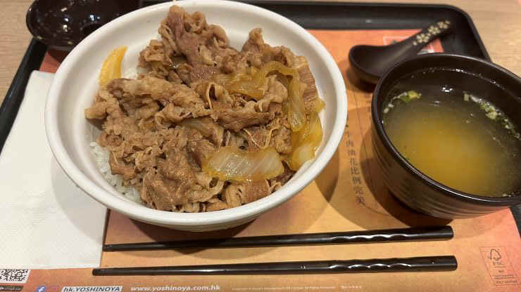 週末返上でガンバってくれている売り子さんたちに差し入れを届けて、激励。日曜で人出も多いので、しっかり売ってもらわないと! ^^ 当地時間正午少し前から売場の傍らに立って様子をチェックします。 (広東語が喋れない)わたしがいても役立たずだな、と思ったら英語しか喋れないインド系のおじさんが立ち止まってくれたり、久しぶりに接客など。お買い上げ、ありがとうございます!(笑) 午後、少し遅めのランチ。 選択の余地はあまりなく、香港に来て恐らくはじめての吉野家さん。 ↓