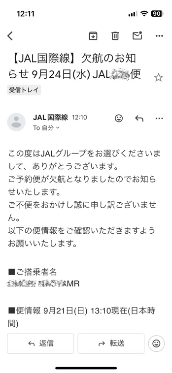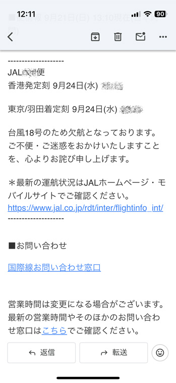 買い物中、JAL より(欠航に伴い)予約をキャンセルするか別のフライトに振り替えるか、メールで問い合わせが。 日本の仕事は金曜なので、1日ズラして木曜に移動することとしました。 ホントは予備日で、いろいろ予定を入れていたのですが仕方ない 〜 ↓