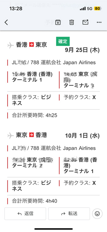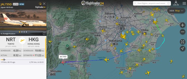 ということで、本日より6泊7日の日本出張 〜 いつものように 海外渡航記録 をアップデートしました。^^ 日本は、今年3月以来ちょうど半年振り。香港に赴任してからはこの6年で通算14回目、ということになります。コロナの3年間がありつつ、何だかんだと年2回ペースか 〜 間もなく10月になりますが、来月ペディションで石垣島、年末年始には一時帰国が決まっているほか、来年3月末にも出張があります。単身赴任の身としては、それぞれいい気分転換になってありがたい! この香港駐在自体もうさほど長くないと思うので、出張にしても一時帰国にしても、貴重な機会として楽しみたいと思っています。 ホントは一昨日移動して今日は日本でひと呼吸入れるつもりでいたのですが、すっかり予定が変わってしまいました。それでも、翌日(本日)のフライトに振替が出来たのはよかった! 仕事は明日なので、今日中に移動しておけば取りあえず何とかなります。^^ 本日のフライトは 日本航空736便(JL736)東京(成田)行。ホントは当地時間10:40発も、2時間半遅れの同12:55発となりました。 このJL736、東京(成田)から来るJL735 が前夜の当地時間22:00に着いて、翌朝10:40発で折り返す、というもの。しかし昨日はそのJL735 が飛べず、日本時間で本日08:05成田発となりました。 そのため、わたしが搭乗するJL736 はこのJL735 が香港に到着するのを待って当地時間12:55発に変更された、というわけ。 JL735 は成田を発って香港に向かっているようなので、取りあえず、JL736 も大丈夫かな。JL735 の到着予想時刻が当地時間11:22で、JL736 は同12:55発で折り返す、というのだから何とも忙しいことよ。 ↓