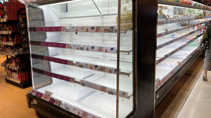 「シグナル8」が出ると、スーパーはじめ店舗はすべて休業となります。 夕方、イオンを覗いてみると、、、棚はキレイに空っぽ。 ↓