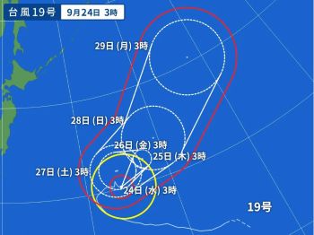 ということで、もともと本日午後のフライトで日本に移動すべく準備を進めていたわけですが、まさかの台風直撃。もちろんフライトは欠航で、出発は明日に順延となりました。(-。-; 香港は、昨日午後に「シグナル8」、日付変わって本日未明に「シグナル9」、そして「シグナル10」が相次いで発出。台風は午前にかけて最接近です。 このあと「台風20号」なんてのまで発生して西に向かっているんだそうで、うーむ。。。(-。-; 予報円の最も東寄りを進んだとするとまた香港も影響を受けそうで、やれやれ、、、です。 まさか、日本から戻って来るあたりとか??? (-。-; ↓ 迷走している「台風19号」は、この予報によれば取りあえず大丈夫そうだけど、、、 ホント、真剣に、10月末の石垣島が心配になって来た。。。(-。-; ↓