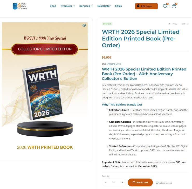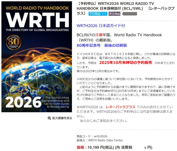日本出張で冷蔵庫をスッカラカンにしていたので、帰り道、食料品の買出しをして帰宅。 3週間振りの山歩き。健康維持に役立っているのかな?(謎) WRTH は、冊子としては2026年版が最後、とのこと。 昔は毎年買っていましたが、いやいや、これがまた場所を取るのなんの。。。(-。-; 過去のWRTHなんてまず見返すことはないのに、自宅の本棚の、かなりのスペースを占領しています。 2022年版が(冊子の)ラスト、みたいなことを聞いて、今考えれば当時の出版元としては、ということだったのかも知れませんが、購入しました。 その後、今の出版元に引き継がれて発行されているわけですが、この2022年版ですらほぼ開いたことがない。旅行とか出張とかに持参したこともない。ほぼ新品のまま本棚行きとなっています。 受信報告書を出さなくなった、というのもありますが、今や、必要な情報はネットで調べられます。わざわざWRTHを買う合理的な理由がない 〜 しかも、99.90ユーロ(+送料)か 〜 (-。-; ↓
