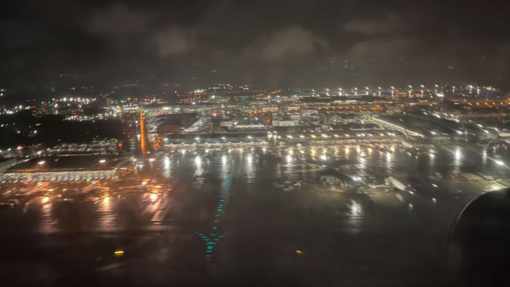 サクララウンジも、インバウンド客が増えてクォリティーが下がりました。特に、果てしなくマナーの悪い大陸系を何とかして欲しい。日本入国前に、オンラインでマナー講座の受講や一般常識試験の合格を義務づける、とか。 それでは間もなく搭乗、です。^^ 本日のフライトは18:20発の日本航空735便(JL735)香港行。機材はB787-8(788)。 あいにくの雨降り。少し遅れて日本時間19時ジャストに離陸です。 さよなら日本、また来る日まで。次回は、10月末の沖縄・石垣島(ペディション)、そして年末年始の一時帰国です。^^