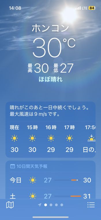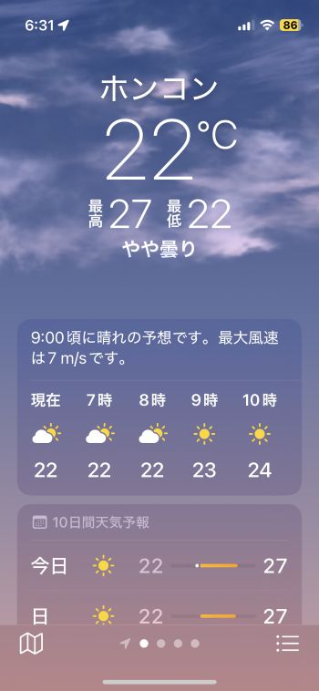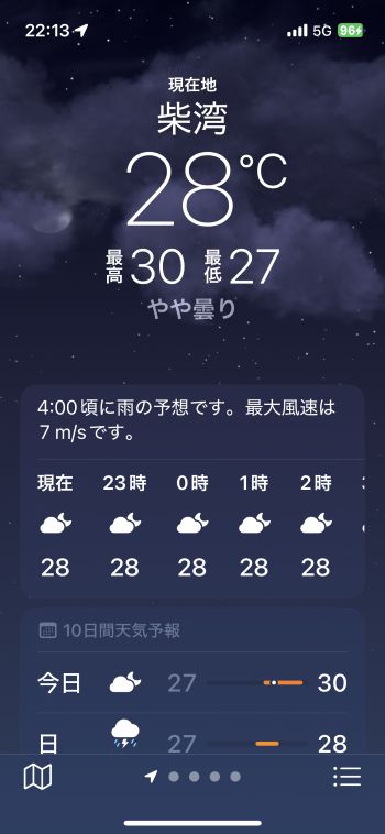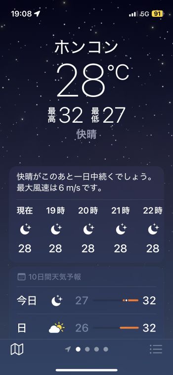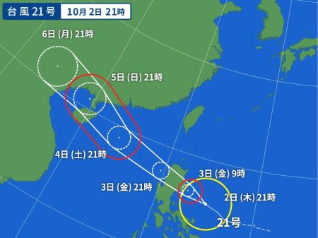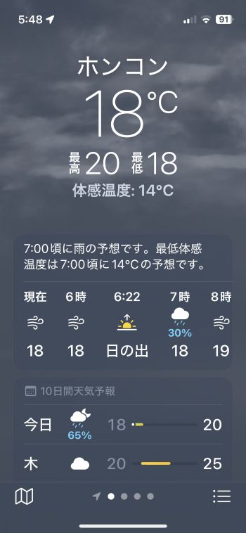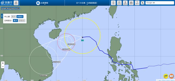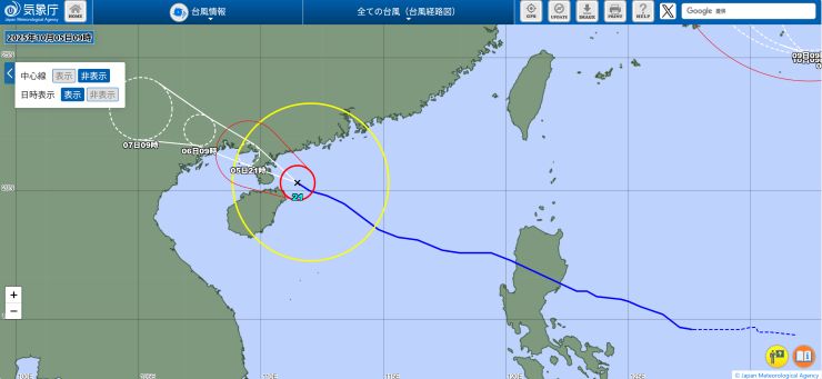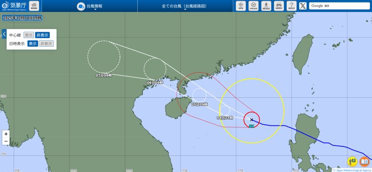 機内でネットに繋いで仕事したり、メールの返信とかしていたら、アッと言う間に台湾上空。その後、少しだけ横になって寝落ちしたらすぐ下降態勢です。 香港国際空港には当地時間22:08着。JALなので到着ゲートもいいポジションを確保していて、香港居民はイミグレもラクチン。プライオリティなのでスーツケースもすぐ出て来て、この時間なので空港からはさすがに的士。 まぁ、Door-to-Doorでは何だかんだと時間がかかるわけですが、それでも午後まで自宅でのんびりしてその日中に帰れるのだから、やっぱり香港は近い 〜 ということで、無事、自宅に到着。^^ 明日、明後日とオフィスに出て、何とか週末に滑り込むこととします。 この1週間まったくラジオ趣味を封印していたので、こちらも再開しないと、、、^^;; ■ 2025年10月2日(木) 〔 TOP 〕 本日より通常の生活に戻りました。^^ およそ1週間振りのオフィスは仕事がいろいろ溜まっていて、朝からあれやこれや。月初め、プラス、下期のスタート、ということでバタバタしていたらアッと言う間に夕方となりました。 10月に入り、かなり日の入り時刻が早くなった感じがします。まだ半袖で全然大丈夫なぐらいムシ暑いけど、これから少しずつ爽やかになって来るかな。 フィリピン方面からは「台風22号」が接近中。 直撃はなさそうだけど、それでも、予想進路の中心線を通るベースで少し強風域が掛かるかも知れず、うーむ。。。(-。-; ↓
