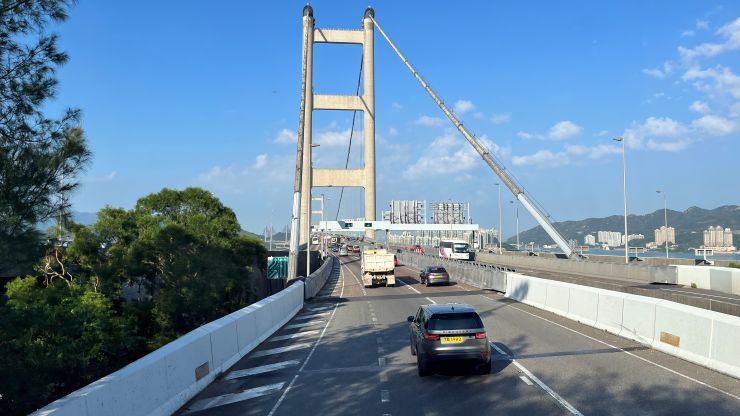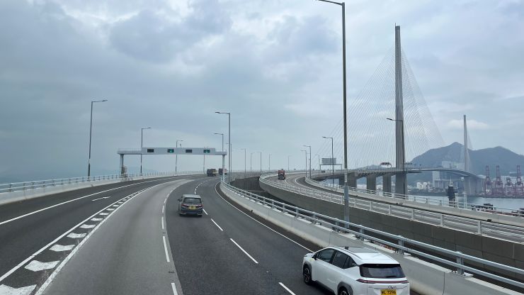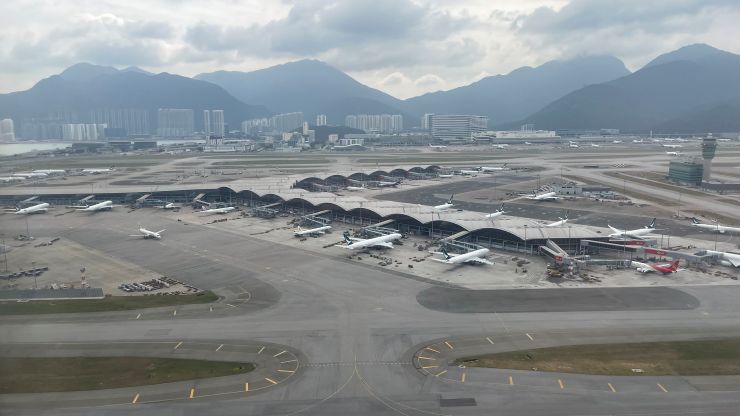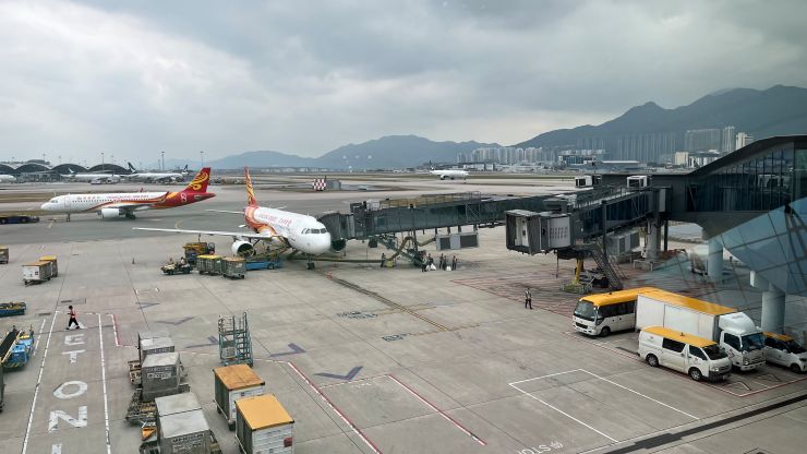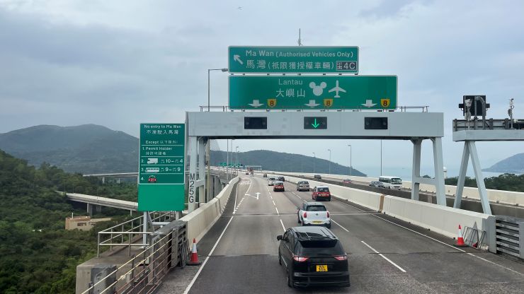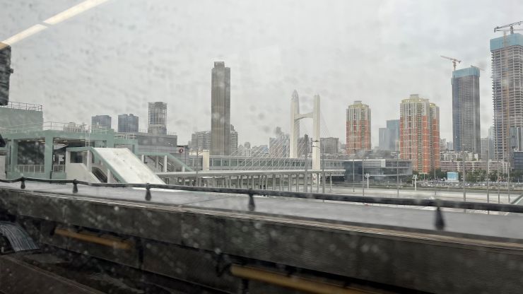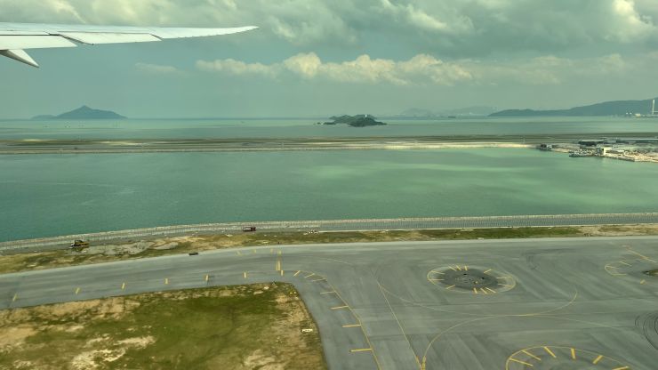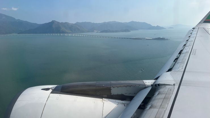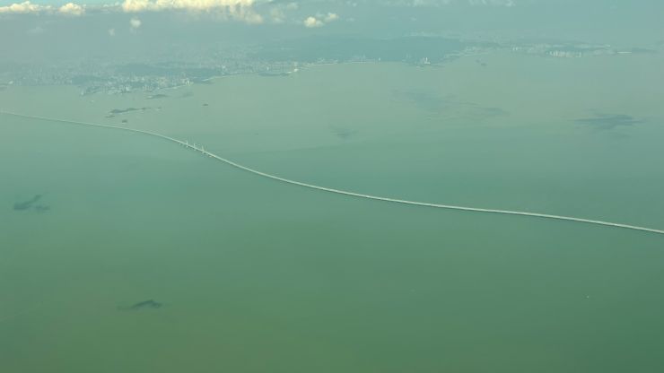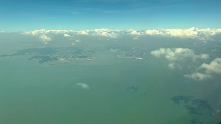 機内では商談のまとめでもしようかと思っていたのですが不覚にも寝落ちしてしまい、気づいたら最終着陸態勢。 港珠澳大橋を右に見ながらランディング 〜 ↓