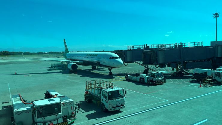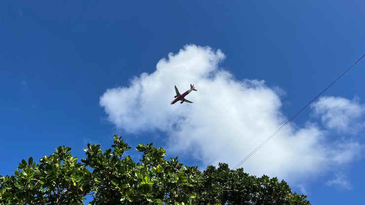 石垣空港に着陸する飛行機が頭上を通過して行きます。ピーチかな。^^ ↓