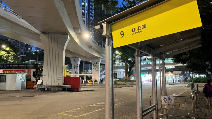 Shau Kei Wanのバスターミナル。9番のバス乗り場。 日中はかなり混雑も、これからビーチに行こうなんて人は誰もいません。^^;; 、、、って、意外とそんなことはなくて、9番バスが通るルートにあるマンションの住民に加えて、終点の石澳泳灘まで乗る人もチラホラ。。。 ↓