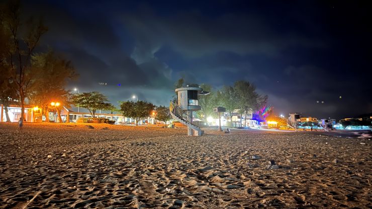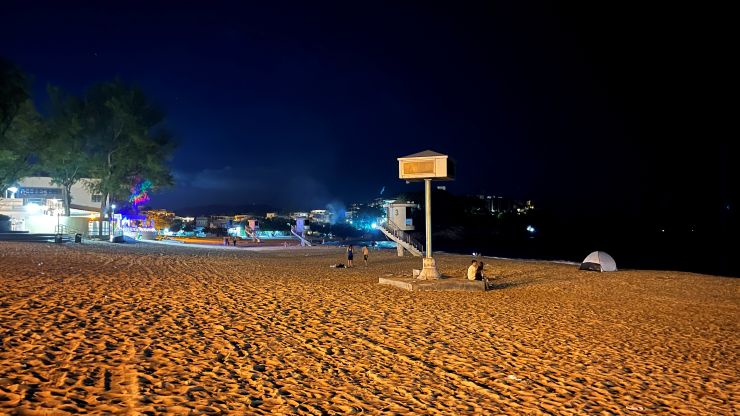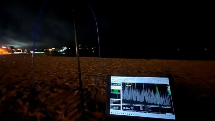 ベンチは先約がいて使えず、街灯ノイズも心配なので、ここはもう砂浜にシートを敷いてラジオ受信を強行するしかないか 〜 (-。-; ビーチは完全に真っ暗闇、というわけではなく、周囲の灯りもあって助かるっちゃ助かるのですが、街灯ノイズがやや心配。。。 それでは、機材をセットアップしてワッチを始めます。当地時間19時半少し前。ほぼ予定通り、です。