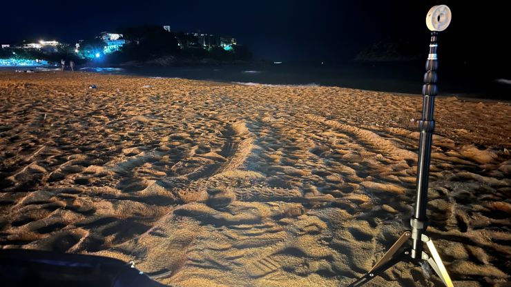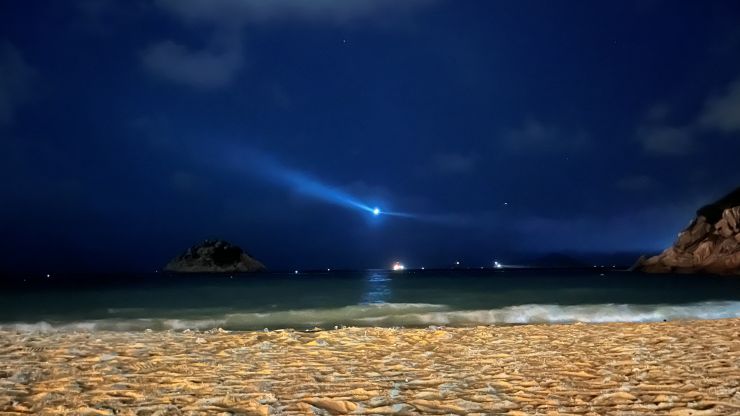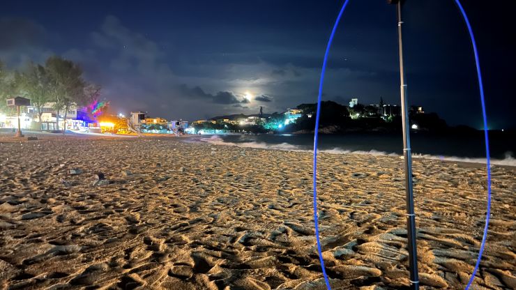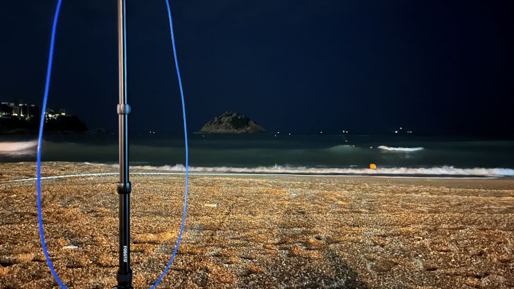 今夜は風もなく、こりゃいいや。気温も、半袖のTシャツでちょうどいいぐらい。 が、思いがけず何カ所か蚊に刺されて、おいおい 〜 念のため持参した薄手の長袖を着て防御しました。(-。-; 前々回(10/11)は今日より風が強く自撮り棒では不安定だったため、今回はアンテナ用にしっかりした三脚を持参しました。安定度、という点はいいとして、唯一の問題は「目立つ」こと。(>_<) ビーチには少なからず人がいて、こちらの人たちはすぐ近くを遠慮なく何やら覗き込むように通って行ったりします。このワッカさえなければ「奇妙度」は抑えられるものの、やはり、これがあるとどうしても目立ってしまいます。(-。-; まぁ、確かに怪しいけどな。^^;; ↓