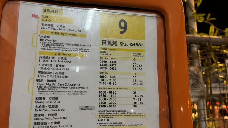 Shau Kei Wan から石澳泳灘まで、9.4香港ドル。昨今のレート(円安)で換算しても180円ぐらい。 物価は世界最高水準の香港にあって、公共交通機関の料金だけは比較的リーゾナブル。180円で終点の石澳泳灘まで行けるのはありがたい! ↓