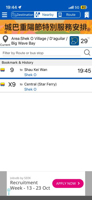 公衆トイレやベンチなどあり、交通アクセスの良さ、という点で香港島では恐らくここがベストのロケーションと思われます。 MTR駅(Shau Kei Wan)から9番のバスでおよそ25分。乗り換えナシ1本で行けるものナイス! バッテリーがどれぐらい持つか分からないし、どのような場所でどれぐらいの時間いられるものかもよく分からないので、取りあえず当地時間19時ちょっと過ぎあたりから長くて同21時ぐらいまで、という想定でバスの時間を調べます。 土曜のこの時間、バスは20分間隔。当地時間18:40にShau Kei Wan発に乗れば同19時少し過ぎには石澳泳灘に着けて、場所探しや機材のセットアップなどしても同19時半あたりから聴けるだろう、と思いました。 Shau Kei Wan までMTR 〜 ↓
