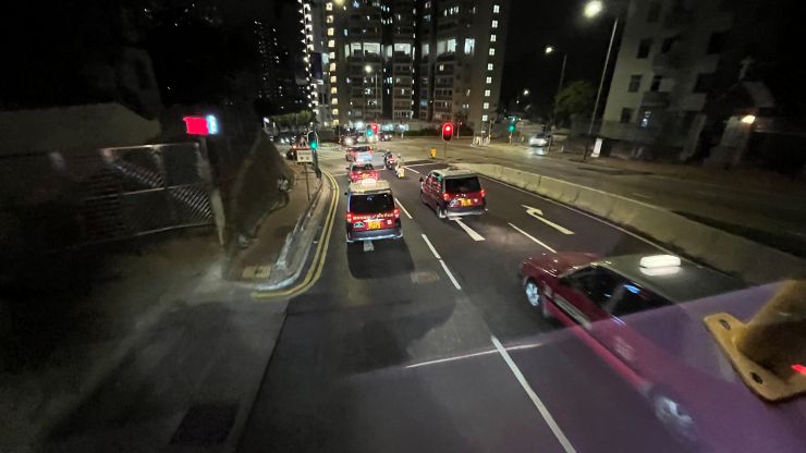 いつものように、ダブルデッカーのアッパーデッキ最前席から前面展望を楽しみます。 この時間はやはり的士が多いですね。 ↓