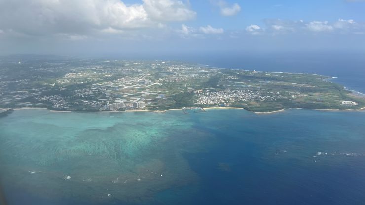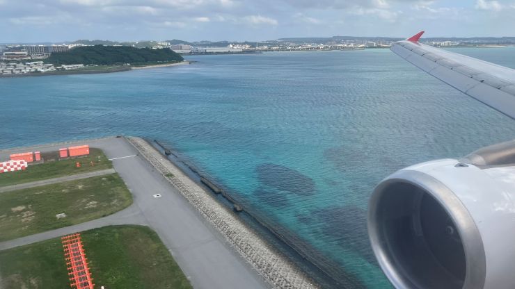 アッと言う間に最終着陸態勢。沖縄本島が見えて来ました。おぉ、海の色が違うな! ↓